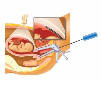 - Тонкой длинной иглой в плаценту проникают через брюшину.